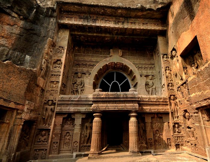 The cave temples and monasteries at Ellora, excavated out of the vertical face of an escarpment, are 26 km north of Aurangabad. Sculptors, inspired by Buddhism, Jainism and Hinduism, created elaborate rock carvings. Extending in a linear arrangement, the 34 caves contain Buddhist Chaityas or halls of worship, Viharas or monasteries and Hindu and Jain temples. Spanning a period of about 600 years between the 5th and 11th century A.D., the earliest excavation here is of the Dhumar Lena (Cave 29). The most imposing excavation is, without doubt, that of the magnificent Kailasa Temple (Cave 16) which is the largest monolithic structure in the world. Known as Verul in ancient times, it has continuously attracted pilgrims through the centuries to the present day.